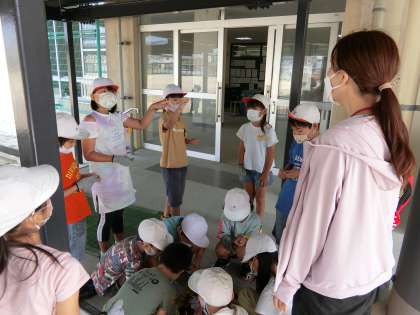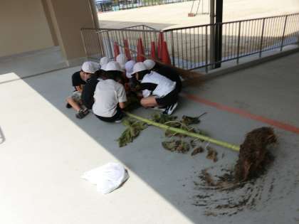 3年生の子どもたちが、立派に育ったひまわりの種を集めています。