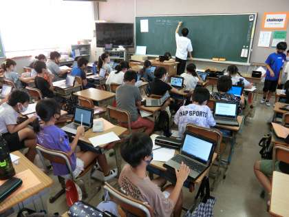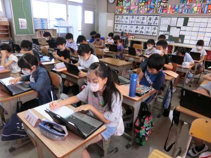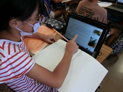一人ひとりが、タブレットPCを使って、阪神淡路大震災について調べています。