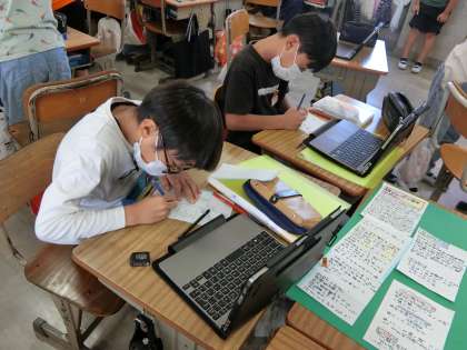 防災について学習したことを発表用にまとめています。