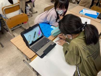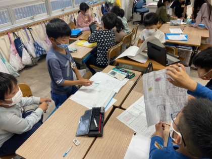 昔と今を比べて知ったことを発表するので、子どもたちはどういう風に発表するのがいいのか、どういった掲示物が必要なのかをみんなで話し合いました。ある班では、「この大きさだと見にくいと思うで。」と言って一番後ろの席の子のことを考えて掲示物を大きく書いたり、ある班では「これの説明した後、クイズ挟んでもいい?」と言って、自分の考えを伝えたりと、それぞれの班で自分ができることを考え行動していました。