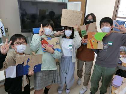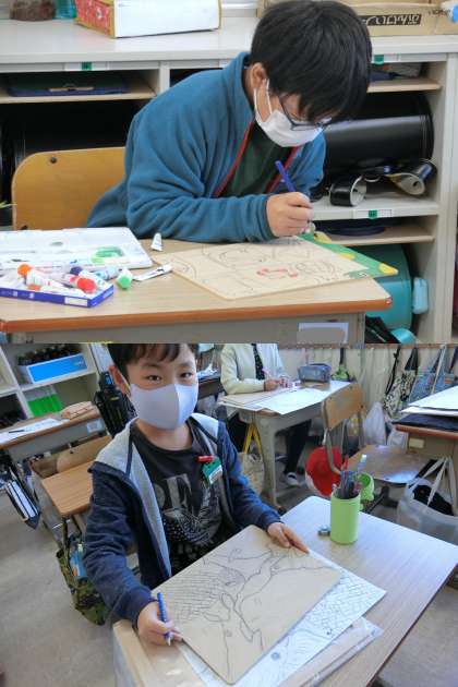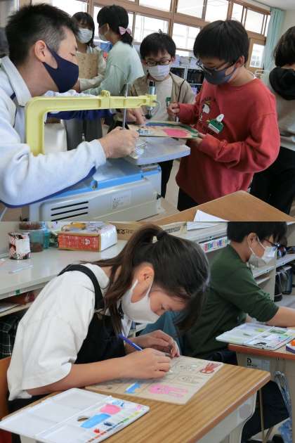 担任の先生といっしょに電動のこぎりを使って、作業しています。