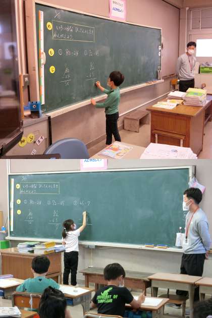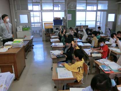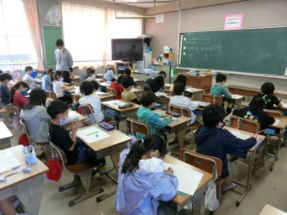 朝礼の話「かかわりを学びに」を意識して、「まちがってもいいよ」という担任の先生の後押しもあって、たくさんの子どもが発表しようとしています。