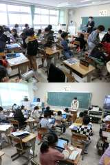 タブレットに取り組んだり、年賀状を書いたりしながら、通知表を受け取っています。...