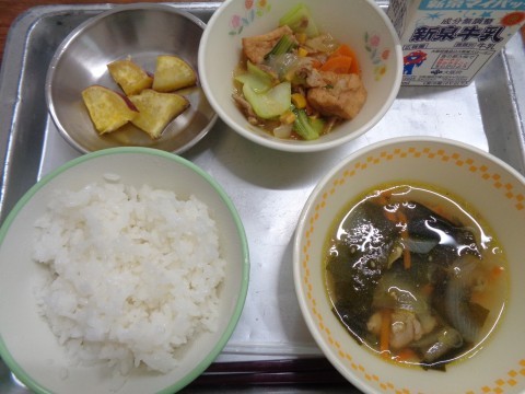 今日の献立は,『ごはん・牛乳・わかめスープ・厚揚げの中華煮・焼き大学芋』です。