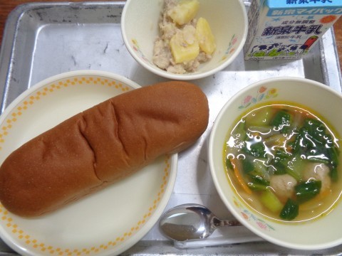 今日の献立は,『ココアパン・牛乳・肉団子スープ・豚肉のみそマヨガーリックいため』です。