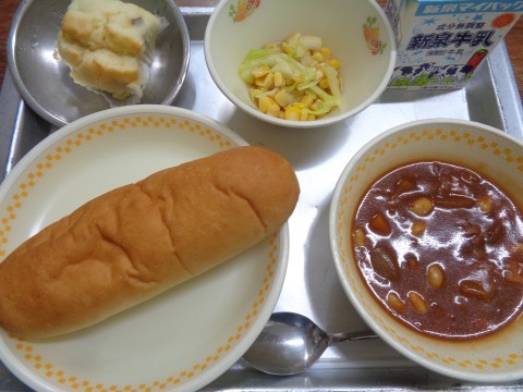 今日の献立は,『ミニコッペパン・牛乳・ビーンズシチュー・コーンキャベツ・さつまいもケーキ』です。