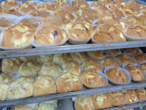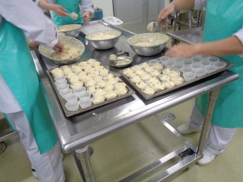 今日は旬のさつまいもを使ったケーキです。さいの目状に切ったさつまいもを生地に入れて,ひとつひとつ手作りしていますよ。