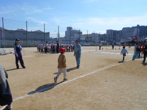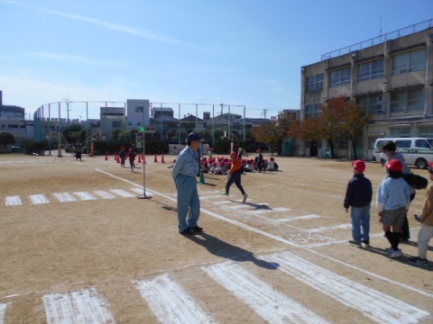 交通安全教室の様子です。1年生が左右を確認しながら,横断歩道を渡ったり,道の端を歩いたりしました。警察やボランティアの保護者のみなさまに教えていただいたおかげで,一つ一つのことに気をつけながら歩くことができました。