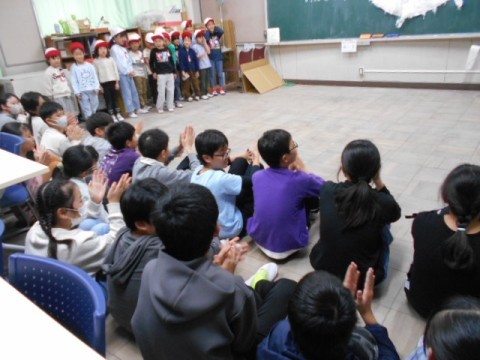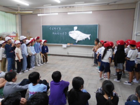 先日,1年生が音読劇を6年生に発表していました。「くじらぐも」のお話を1年生ははきはきとした声で発表し,6年生は優しいまなざしで見て,大きな拍手を送っていました。