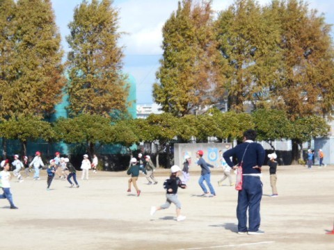 運動場で子どもたちがたくさん遊べるように,体育委員会がドッジボール大会を企画してくれました。今日は一年生の日。おにごっこを楽しんでいました。