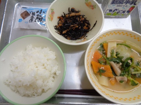 今日の献立は、『ごはん・牛乳・ほうとう・ひじきの甘煮・小魚の佃煮』です。