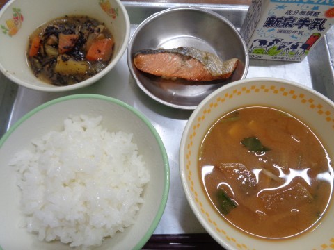 今日の献立は、『ごはん・牛乳・赤だし・焼き鮭・じゃがいもの磯煮』です。