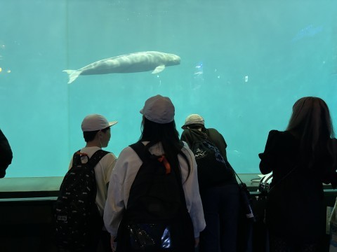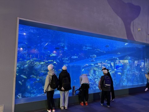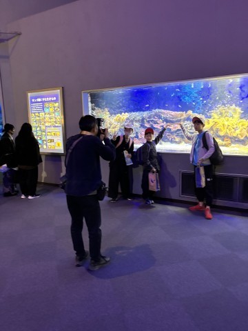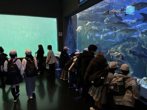 子どもたちは、大きくてきれいな水槽の生き物に見入っていました。