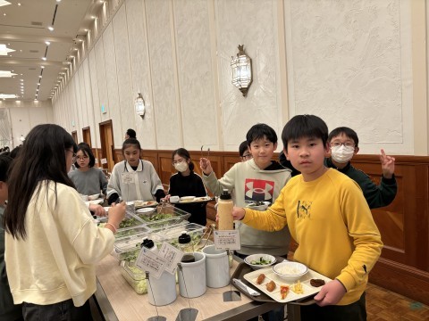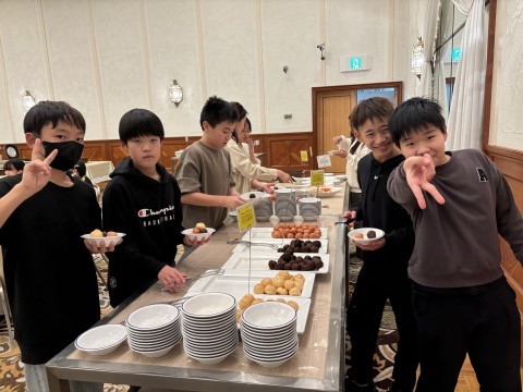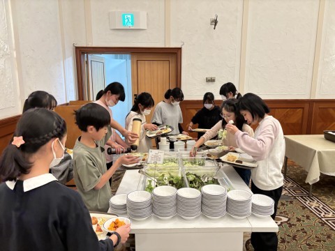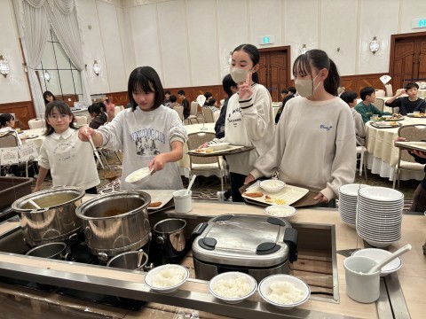 バイキングの様子です。ナポリタン、カレーライス、エビフライ、フライドポテト、焼きそばなど、子どもたちが好きそうなメニューが並んでいましたよ。みんなよく食べていました。