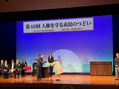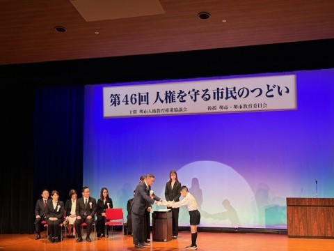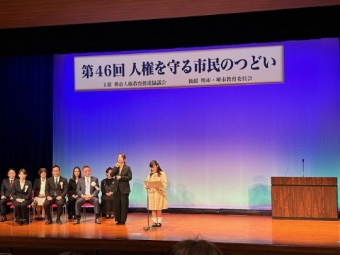 夏休みの宿題で書いた「わたしからの人権メッセージ」の表彰式がありました。本校から2人,特選に選ばれ,そのうち一人が舞台上で作品を発表いたしました。今回,4396の作品の応募があったそうです。小学生の特選はこの2人だけだったそうですよ。すばらしいですね。おめでとうございます。