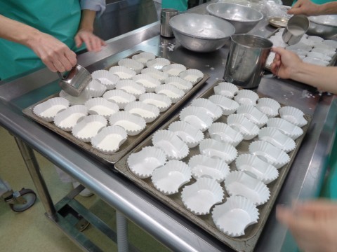 ういろうは、米粉に砂糖や水を練り混ぜ蒸して作る和菓子です。今日の給食では、米粉・砂糖・水で作った生地を、オーブンで蒸し焼きにしました。もっちりとした食感に仕上がっています。