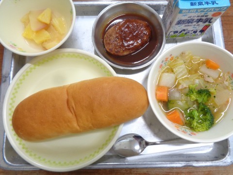 今日の献立は、『ミルクパン・牛乳・冬野菜スープ・ハンバーグのソースかけ・とろりフルーツコンポート』です。