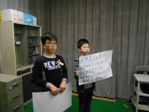 今日は,終業式でした。校長先生から,心の通知表についてお話があり,いくつかの質問についてそれぞれがふりかえりを行いました。児童会の児童からは,冬休みの過ごし方について,問題を出しながら正しいことを教えてくれました。最後に,生徒指導担当の先生から,南っ子のきまりを振り返ったあと,「いかのおすし」について確認がありました。