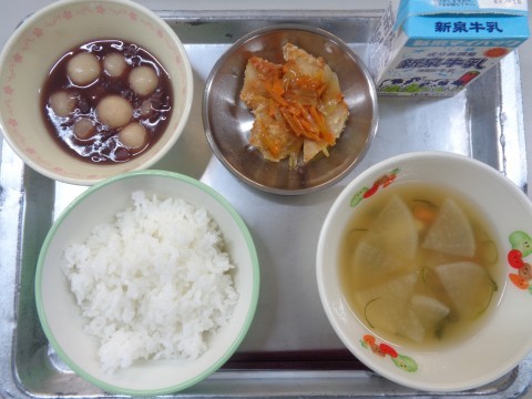 今日の献立は、『ごはん・牛乳・のっぺい汁・鶏唐揚げの野菜あんかけ・白玉ぜんざい』です。