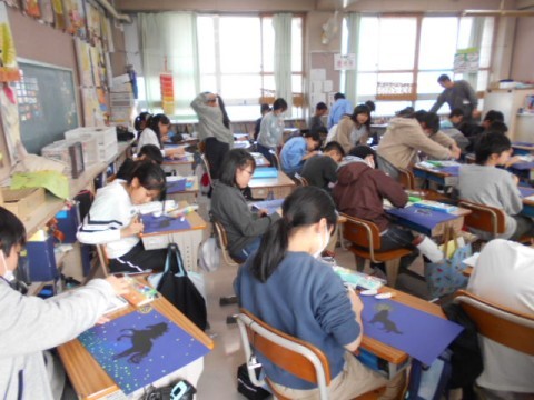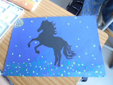 5年生では図工でアボリジニアートに取り組んでいました。子どもたちは綿棒に絵の具をつけて,ポンポンと色をつけていましたよ。美しいですね!