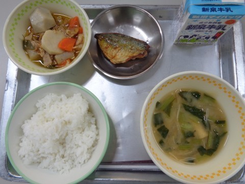 今日の献立は、『ごはん・牛乳・みそ汁・あじのみりん干し・芋煮』です。