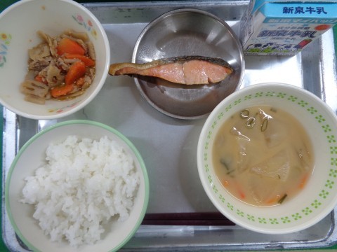 今日の献立は、『ごはん・牛乳・すいとん汁・さけの風味焼き・れんこんのきんぴら』です。