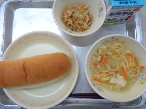 今日の献立は、『ミニコッペパン・牛乳・クリームスパゲティ・ホットサラダ』です。