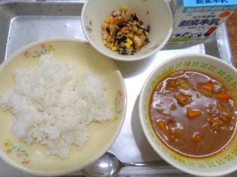 今日の献立は、『ポークカレーライス・牛乳・豆とひじきのサラダ』です。
