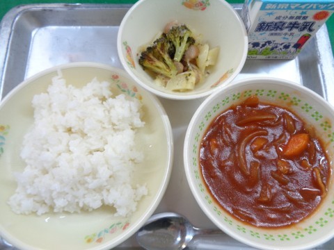 今日の献立は、『ハヤシライス・牛乳・じゃがいものチーズ焼き』です。