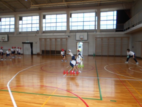 体育の様子です。走っていって,一番後ろのミニコーンを一番前にして,走って戻る。それをリレーでやっていました。盛り上がっていましたよ♪