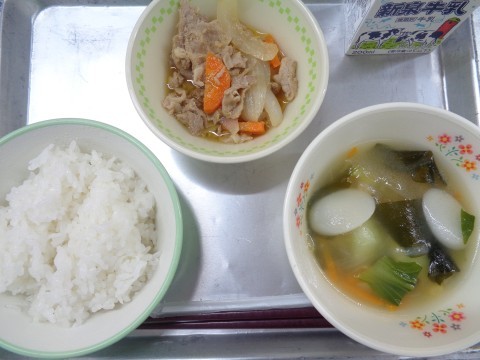 今日の献立は、『ごはん・トックとわかめのスープ・豚肉のプルコギ風・牛乳』です。
