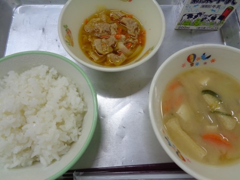 今日の献立は『ごはん・牛乳・五目汁・豚肉のしょうが炒め』です。