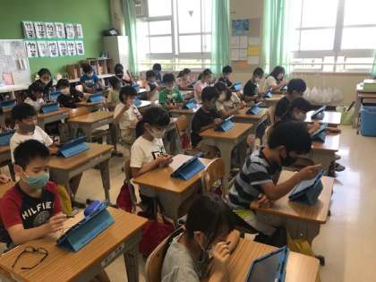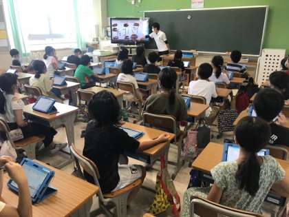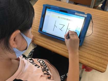 全員がそれぞれ一台ずつタブレットを持ち、学習を進めました。担任がデータでプリントを配付し、子どもたちは、タッチペンで答えを入力します。