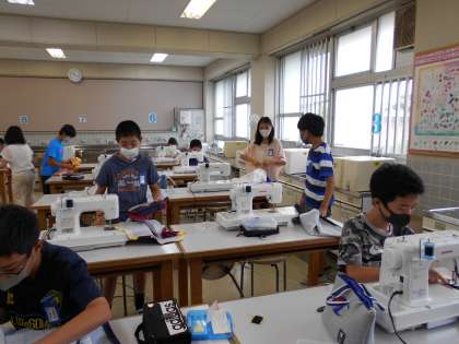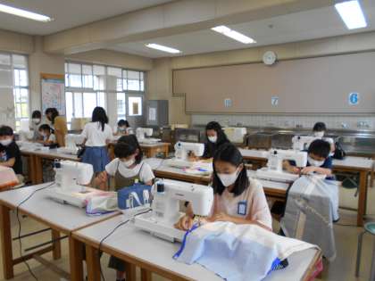 エプロン作りです。 教室での学習と並行しながら,家庭科室でミシンを使用する人数を減らしています。
