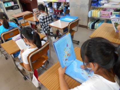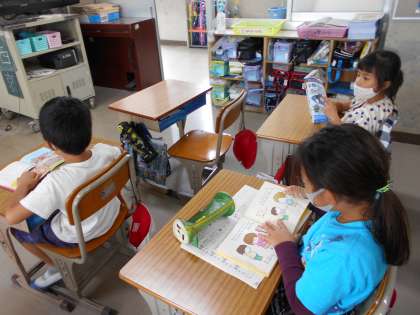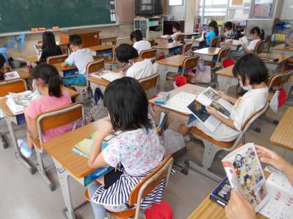 図書室で本を借りて,教室で読書をしています。