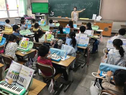 音楽の時間には、鍵盤ハーモニカで、「ド」と「レ」と休符を使って音楽をつくりました。