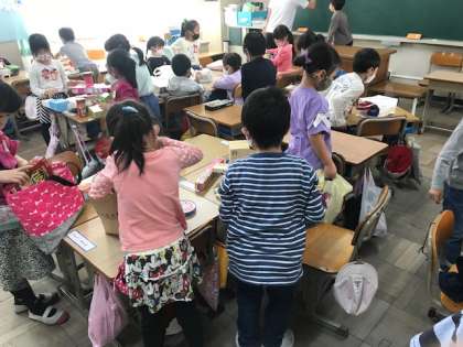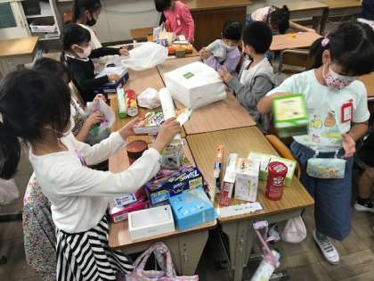 また、算数では、おうちから持ってきた箱を使って、形の学習をしました。