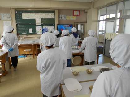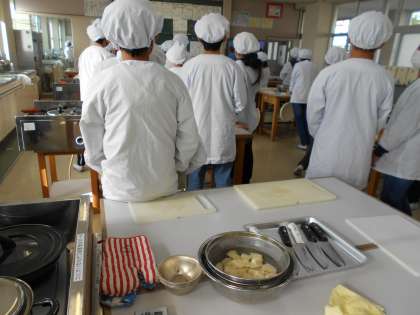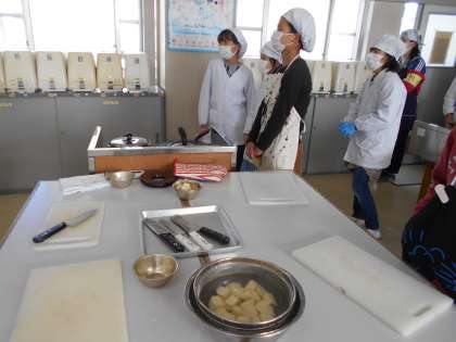 ジャガイモの下ごしらえが終わって,次の説明を聞いています。