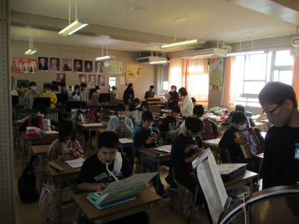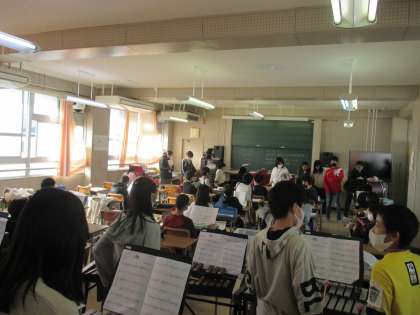みんな間隔をあけて集中して取り組んでいます。難しい曲にチャレンジしていますが,気持ちを一つにしてがんばっています。