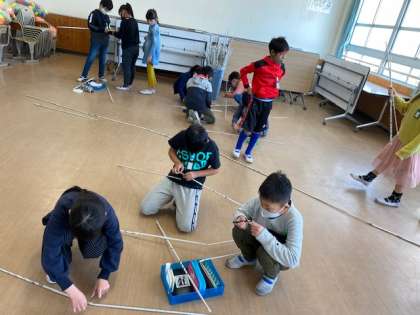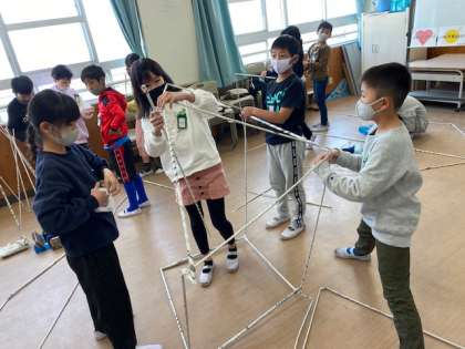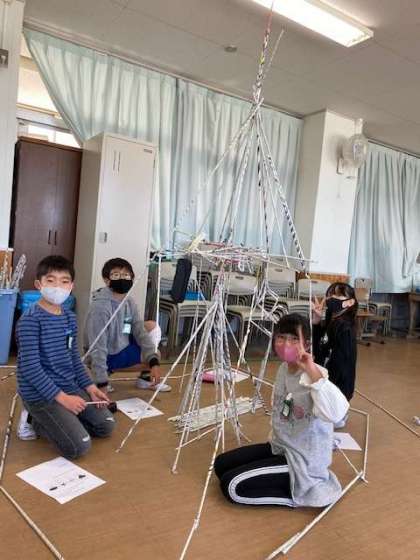 大量に作った新聞棒を、どんどんつないで高くしたり長くしたりしました。高くするためにはどうすればいいか考えながら、活動していました。