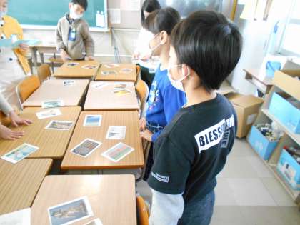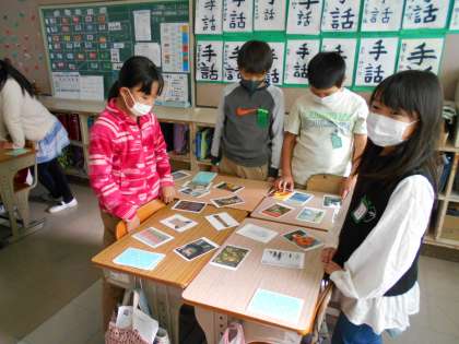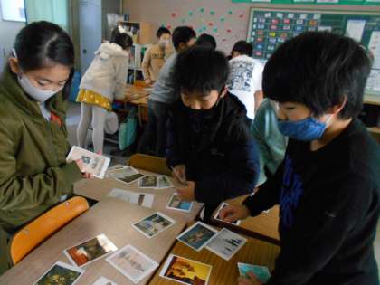 前時までに,それぞれがカードを選んで,その作品についての説明を「五・七・五」で書きました。今日は,その説明を聞いて,どのカードかを考えるゲームです。