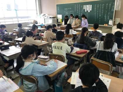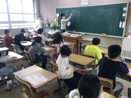4年生は、通知表を受け取ったり、算数の学習をしたり、学習係が中心となって答え合わせをしたりしていました。