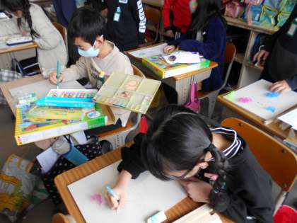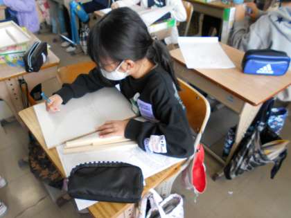 木を使って,制作中です。 下絵も丁寧に描いています。