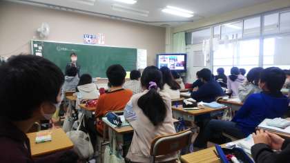 『My Junior High School』の単元の導入として、金岡南中学校での生活や学習、部活や行事について、話をしてもらいました。