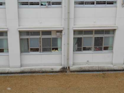真冬の寒さに戻り,雪が舞いました。 教室の窓から,雪を眺める児童たちです。