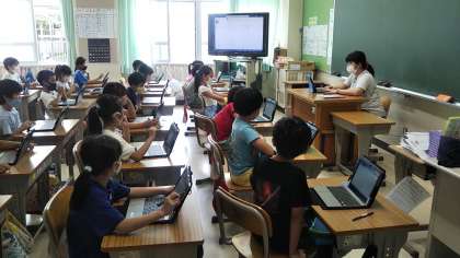 写真上:パソコンの設定作業 写真下:植物の発芽の観察