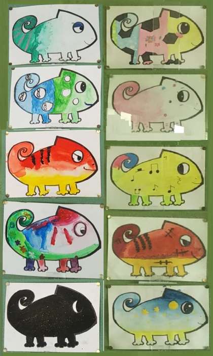 校内掲示板に展示している、3年生の色とりどりのカメレオンたち。ユニークなカメレオンがいっぱい誕生しました。