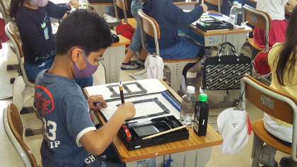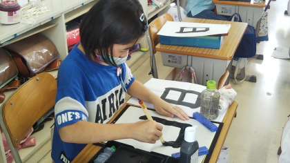 筆をしっかり立てて、半紙に筆を下ろす緊張の瞬間。背筋がピンと伸びています。習字は姿勢をよくしてくれます。