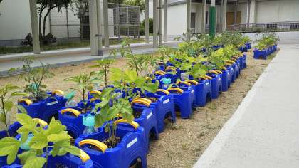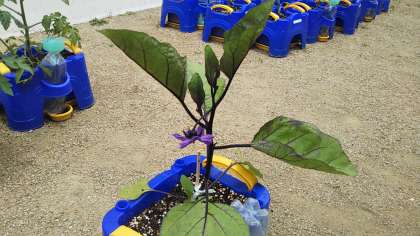 2年生は野菜を栽培しています。トマトもオクラも枝豆もなすびも、ここのところぐんぐん大きくなっています。茄子には紫色の花が咲いています。大きな実がなりそうです!