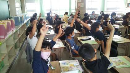 先生の英語を聞いて反応しています。楽しみながら学んでいます。